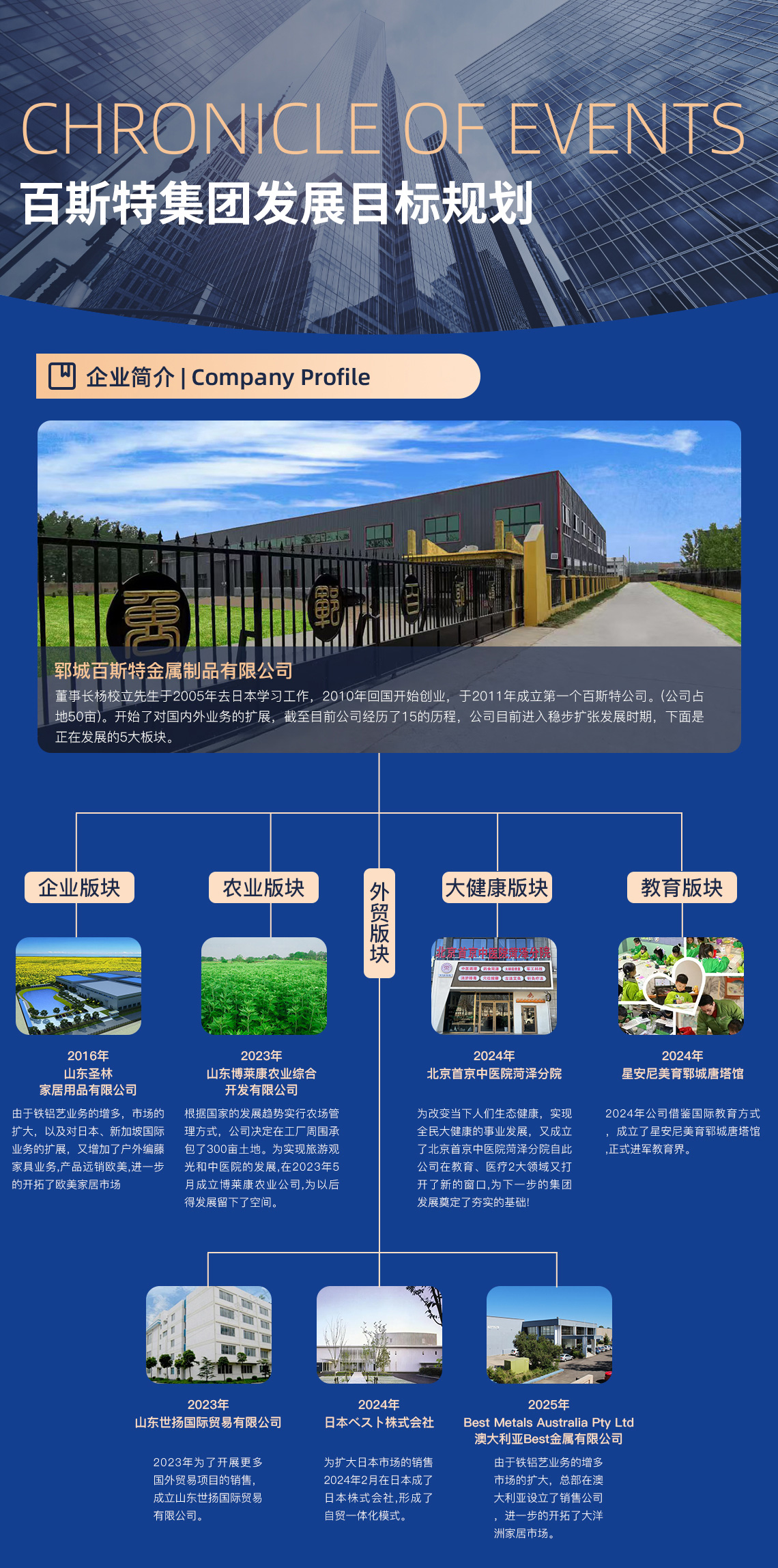 鄆城百斯特金屬制品有限公司位于山東鄆城,東接京九鐵路,南接日東、濟廣高速,交通便利。公司占地30000平方米,是專業(yè)生產(chǎn)和銷售鐵藝制品、鋁藝制品、不銹鋼制品、藤鐵家具、鋼木家具、農(nóng)業(yè)設(shè)備等綜合性企業(yè),擁有雄厚的技術(shù)力量,先進的生產(chǎn)設(shè)備,專業(yè)的研發(fā)隊伍,并建立嚴謹?shù)墓芾碇贫龋纬闪烁挥刑厣钠髽I(yè)文化。...